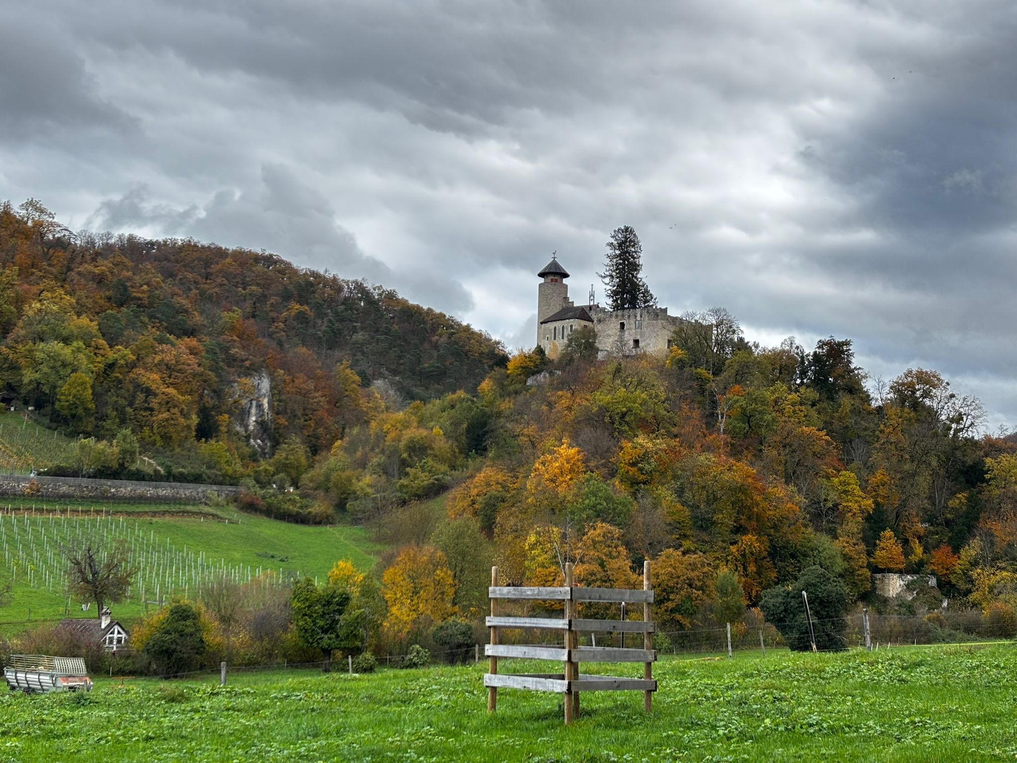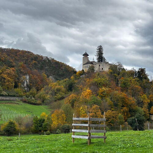 Bald verliessen wir das Dorf und tauchten in den herbstlichen Wald ein. Der Weg führte über sanft ansteigende Naturpfade, vorbei an moosbewachsenen Felsen und buntem Laub, das unter unseren Schritten raschelte. Nach einem angenehmen Aufstieg erreichten wir die Burg Birseck, wo sich ein besonders stimmungsvoller Ort befindet – der Temple Rustique. Hier, im Schutz des hölzernen Pavillons, machten wir unsere Mittagsrast. Bei Brot, Käse, Äpfeln und heissem Tee genossen wir die ruhige Atmosphäre und den weiten Blick über das Tal.