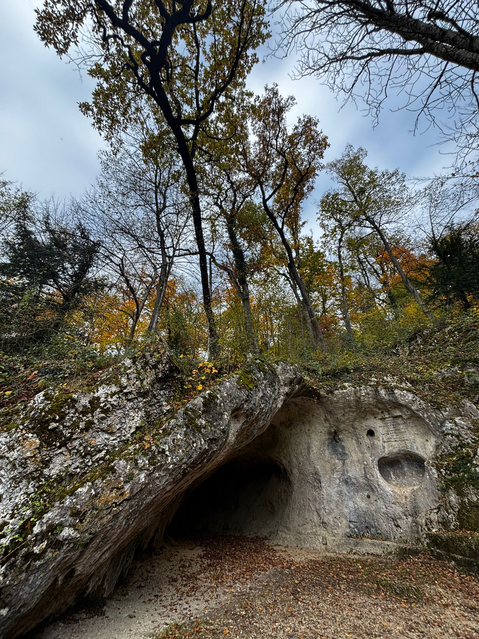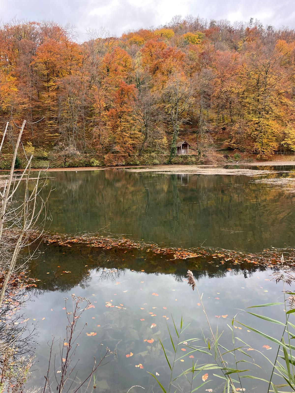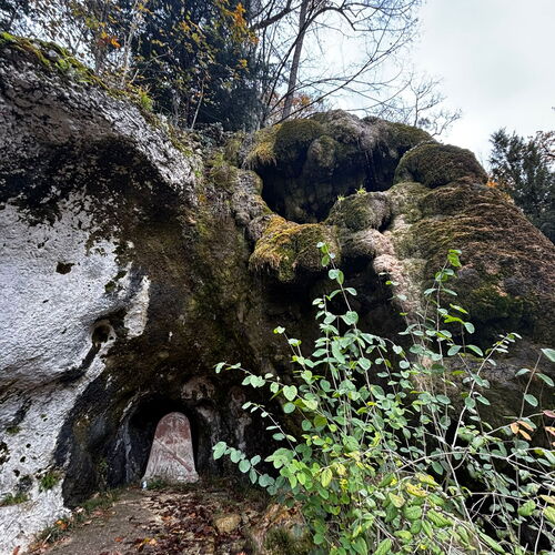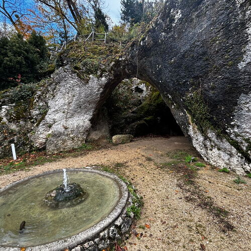 Gestärkt setzten wir unsere Wanderung fort – vorbei an der geheimnisvollen Grotte, der kleinen Waldbruderklause und einem stillen Teich, auf dessen Oberfläche goldene Blätter trieben. Der Weg führte sanft hinunter, auf bequemen Tritten, begleitet vom leisen Rauschen des Bächleins und dem Duft des feuchten Waldes.